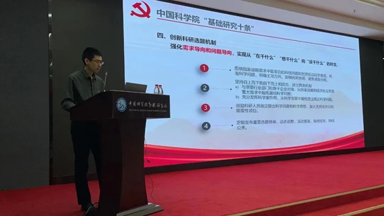 会议第一部分是“习近平总书记关于加强基础研究”的专题学习。由王昱凯同志带领大家学习了习近平总书记关于加强基础研究的重要讲话。报告围绕加强基础研究的重要性;强化基础研究前瞻性、战略性、系统性布局;深化基础研究体制机制改革;协同构建中国特色国家实验室体系;加强国家急需高层次人才培养;中国科学院基础研究十条等几点进行了详细介绍。强调加强基础研究是实现高水平科技自立自强的迫切要求,是建设世界科技强国的必由之路。